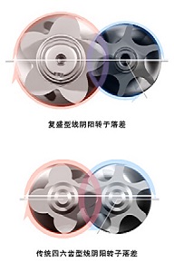 主转子转速高,直径大,副转子转速较低,直径较小,这个设计使两个转子的刚度完全相等。